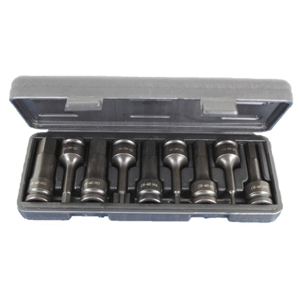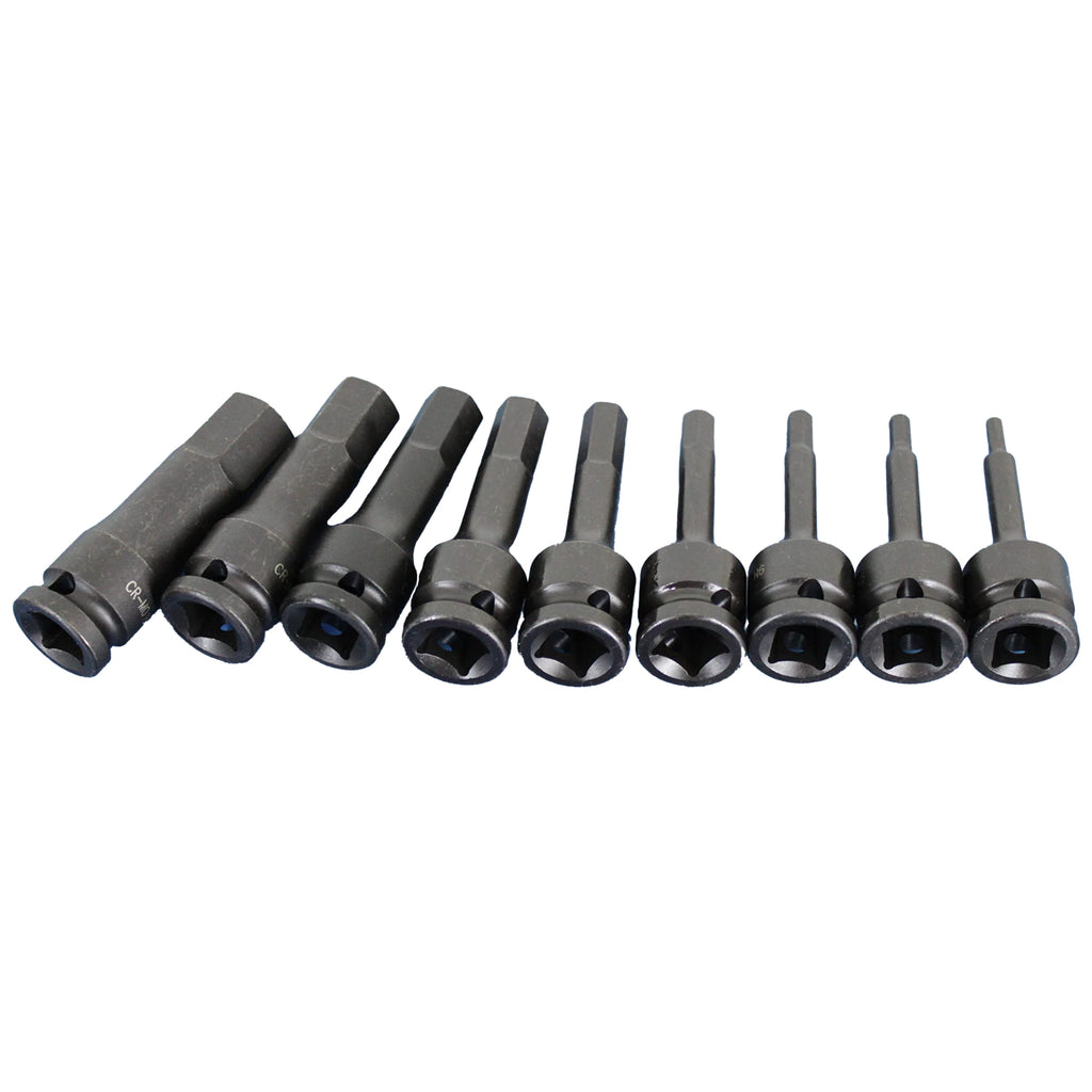 9 pc of Impact Hex Socket Bit Set Kits: H4 5 6 8 10 12 14 17 19mm The socket bits are 3-1/8" (80mm) long. 1/2" (12.7mm) Sqaure Drive with drive release holes. Drop forged black chrome moly steel (CR-MO). Industrial grade quality. Suitable for air tools and electric tools. US-BASED CUSTOMER SERVICE: Available by chat, email, phone, or visit us at our customer service center in La Crosse, WI.