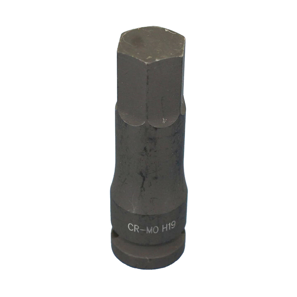 Impact Hex Socket Bit H19 mm The socket bit is 3-1/8" (80mm) long. 1/2" (12.7mm) Sqaure Drive with drive release holes. Drop forged black chrome moly steel (CR-MO). | Industrial grade quality. Suitable for air tools and electric tools. US-BASED CUSTOMER SERVICE: Available by chat, email, phone, or visit us at our customer service center in La Crosse, WI.