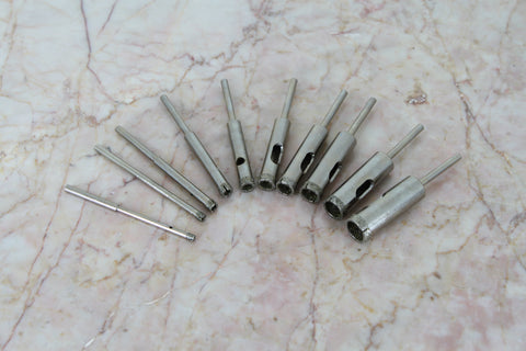 New assorted 3-12mm (1/8" to 1/2") PREMIUM diamond coated hole saw (total: 10 pc, 3, 4, 5, 6, 7, 8, 9, 10, 11, 12 mm). Manufactured by GRIT 50 premium type diamond sands specail for cutting. Suitable for use in drill hole on glass, marble, tile or granite. ALL in 1/8" (3.175mm) shank fit your hand drill, drill press & for Dremel and Foredom tool with a 1/8" (3.175mm) collet Working length : 35mm US-BASED CUSTOMER SERVICE: Available by chat, email, phone, or visit us at our customer service center in La Crosse, WI.