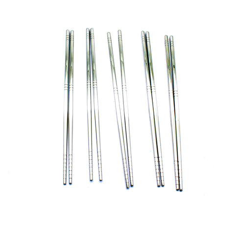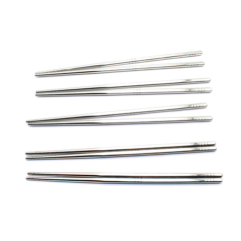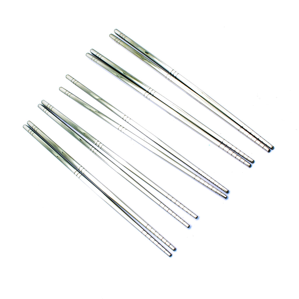 5 PAIRS: Five pairs of stainless-steel chopsticks, hollow and light. DISHWASHER SAFE: Stainless steel allows for easy cleaning and reusability. SHINY SILVER: Chopsticks have a shiny silver color for an aesthetic look. EASY FOOD PICKUP: Small circles at the tips make picking up food easy and efficient. US-BASED CUSTOMER SERVICE: Available by chat, email, phone, or visit us at our customer service center in La Crosse, WI.