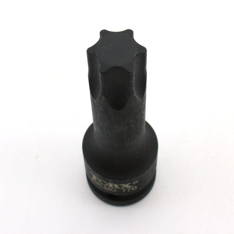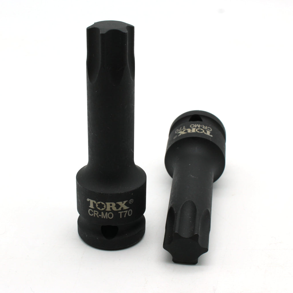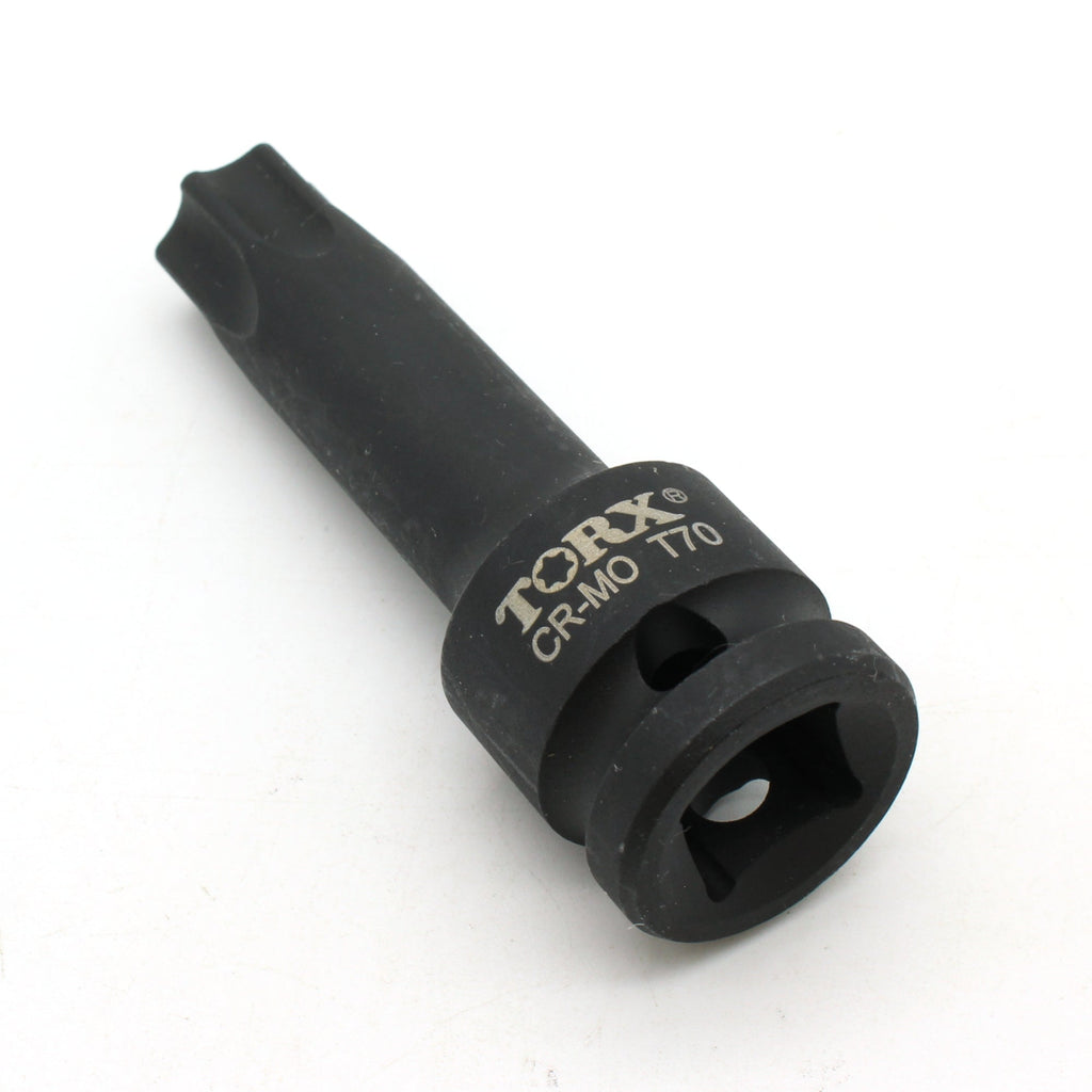 Impact Torx Star 6 point Socket Bit T70 The socket bit is 3-1/8" (80mm) long. 1/2" (12.7mm) Sqaure Drive with drive release holes. Drop forged black chrome moly steel (CR-MO). Industrial grade quality. Suitable for air tools and electric tools. US-BASED CUSTOMER SERVICE: Available by chat, email, phone, or visit us at our customer service center in La Crosse, WI.
