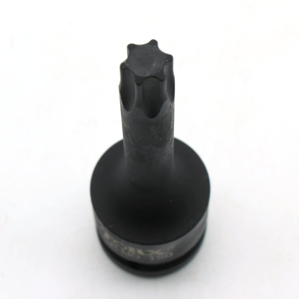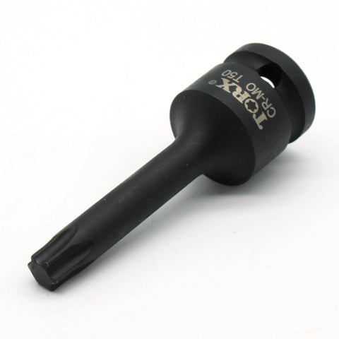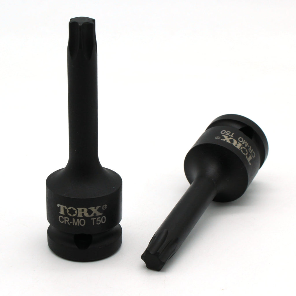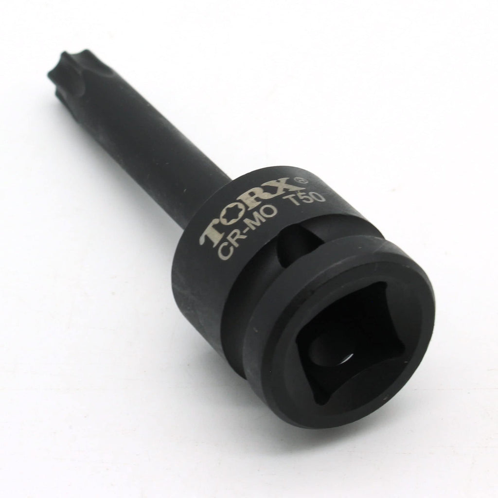 Impact Torx Star 6 point Socket Bit T50 The socket bit is 3-1/8" (80mm) long. 1/2" (12.7mm) Sqaure Drive with drive release holes. Drop forged black chrome moly steel (CR-MO). Industrial grade quality. Suitable for air tools and electric tools. US-BASED CUSTOMER SERVICE: Available by chat, email, phone, or visit us at our customer service center in La Crosse, WI.