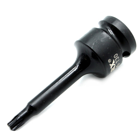 Impact Torx Star 6 point Socket Bit T30 The socket bit is 3-1/8" (80mm) long. 1/2" (12.7mm) Sqaure Drive with drive release holes. Drop forged black chrome moly steel (CR-MO). Industrial grade quality. Suitable for air tools and electric tools. US-BASED CUSTOMER SERVICE: Available by chat, email, phone, or visit us at our customer service center in La Crosse, WI.