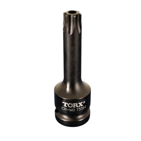 Impact Torx Star 6 point Socket Bit T55 The socket bits are Tamper proof with center hole. All are 3-1/8" (80mm) long. 1/2" (12.7mm) Sqaure Drive with drive release holes. Drop forged black chrome moly steel (CR-MO). Industrial grade quality. Suitable for air tools and electric tools. US-BASED CUSTOMER SERVICE: Available by chat, email, phone, or visit us at our customer service center in La Crosse, WI.