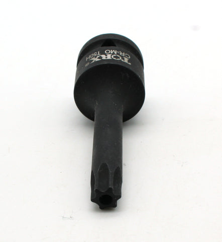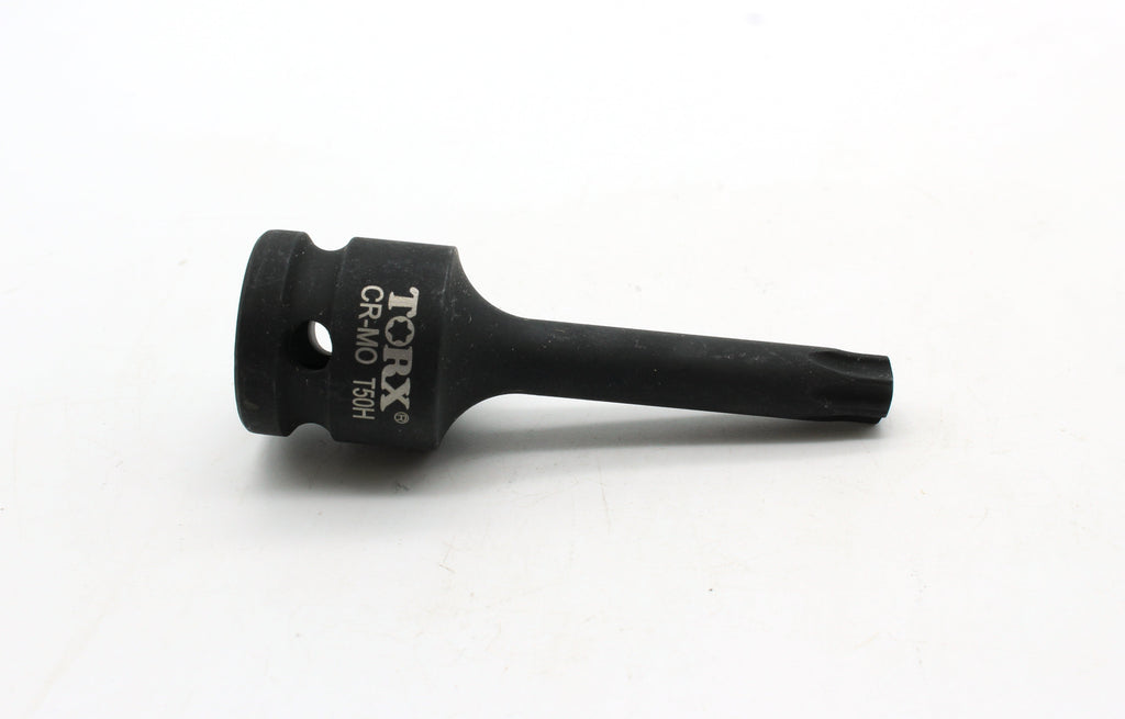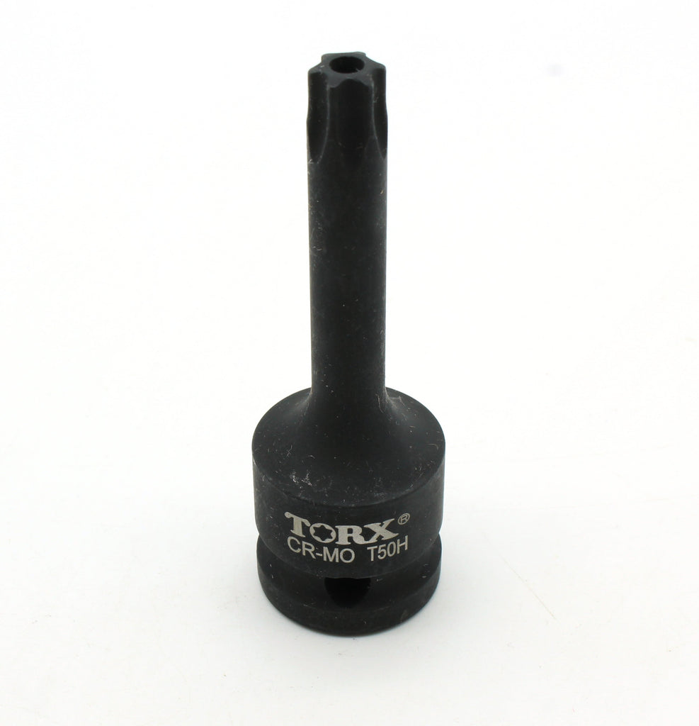 Impact Torx Star 6 point Socket Bit T50 The socket bits are Tamper proof with center hole. All are 3-1/8" (80mm) long. 1/2" (12.7mm) Sqaure Drive with drive release holes. Drop forged black chrome moly steel (CR-MO). Industrial grade quality. Suitable for air tools and electric tools. US-BASED CUSTOMER SERVICE: Available by chat, email, phone, or visit us at our customer service center in La Crosse, WI.