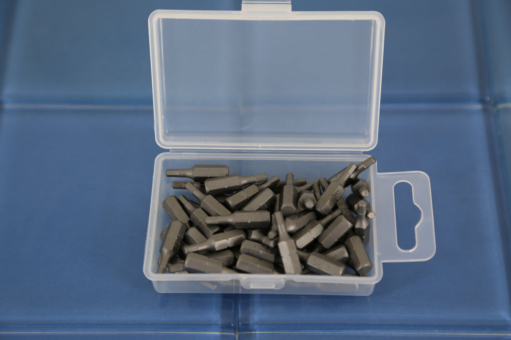 SCREWDRIVER INSERT BITS: 50 pc H-3 Hex 3mm Screwdriver Insert Bits in a plastic storage case.