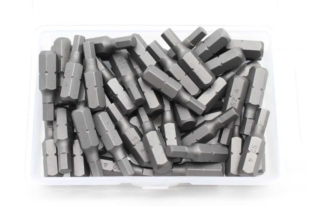 SCREWDRIVER INSERT BITS: 50 pc H-4 Hex 4mm Screwdriver Insert Bits in a plastic storage case.