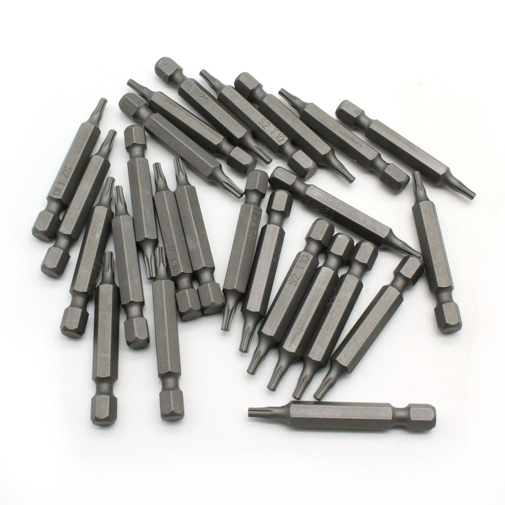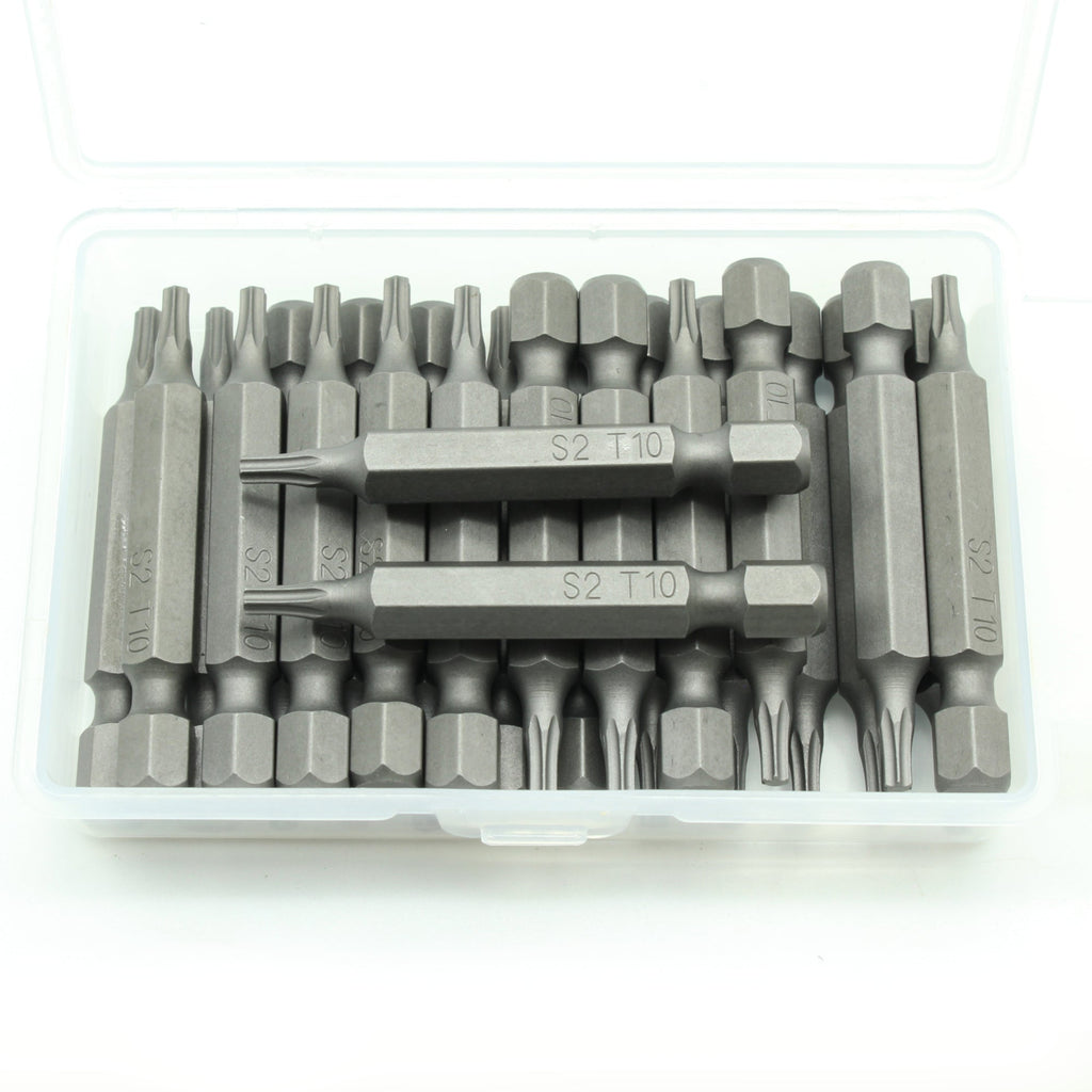 SCREWDRIVER INSERT BITS: 25 pc T-10 Torx 6 Point Screwdriver Insert Bits in a plastic storage case.