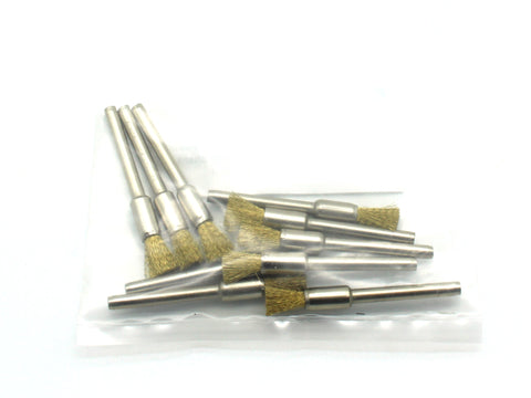 New 10 pc 537 brass wire brushes in pen shape. They will fit your hand drill, drill press & for Dremel and Foredom tool with a 1/8" (3.175mm) collet. Overall length is 51mm (2 inch), pen diameter is 1/4" (6.35mm) Shank diameter : 3.17mm (1/8 inch). Suitable for removing rust and oxidation. US-BASED CUSTOMER SERVICE: Available by chat, email, phone, or visit us at our customer service center in La Crosse, WI.
