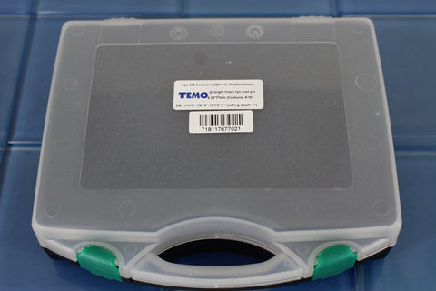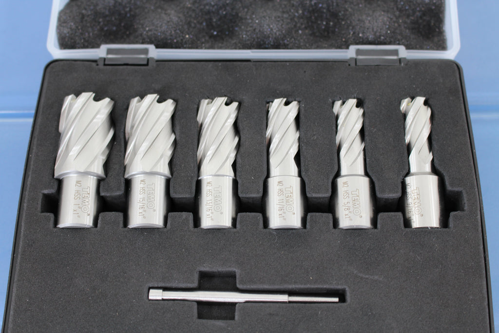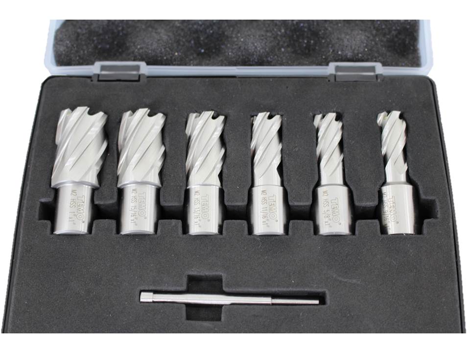 Set includes sizes: 9/16" (14.29mm), 5/8" (15.88mm), 11/16" (17.46mm), 13/16",15/16" (23.81mm), and 1" (25.4mm). Set also includes one pilot pin, all within a heavy duty case.