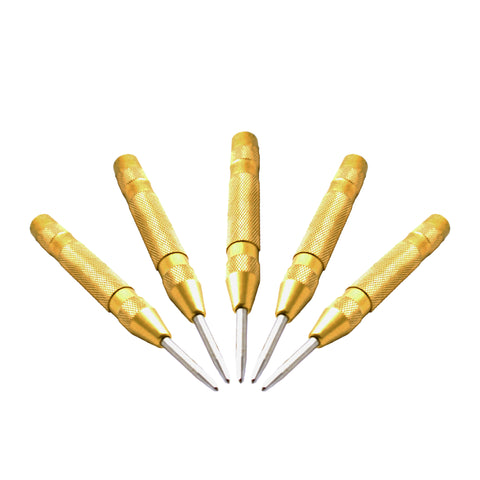 Automatic Center Punch (Pack of 5) Heat treated alloy steel point. Brass body, chrome plated tip. Knurled handle for stable grip. Start or mark holes for drilling, screwing, and riveting. Automatically strikes surface with a powerful spring action when pressed. 5" overall length with a 1/2" (12.7mm) diameter handle (per punch) US-BASED CUSTOMER SERVICE: Available by chat, email, phone, or visit us at our customer service center in La Crosse, WI.