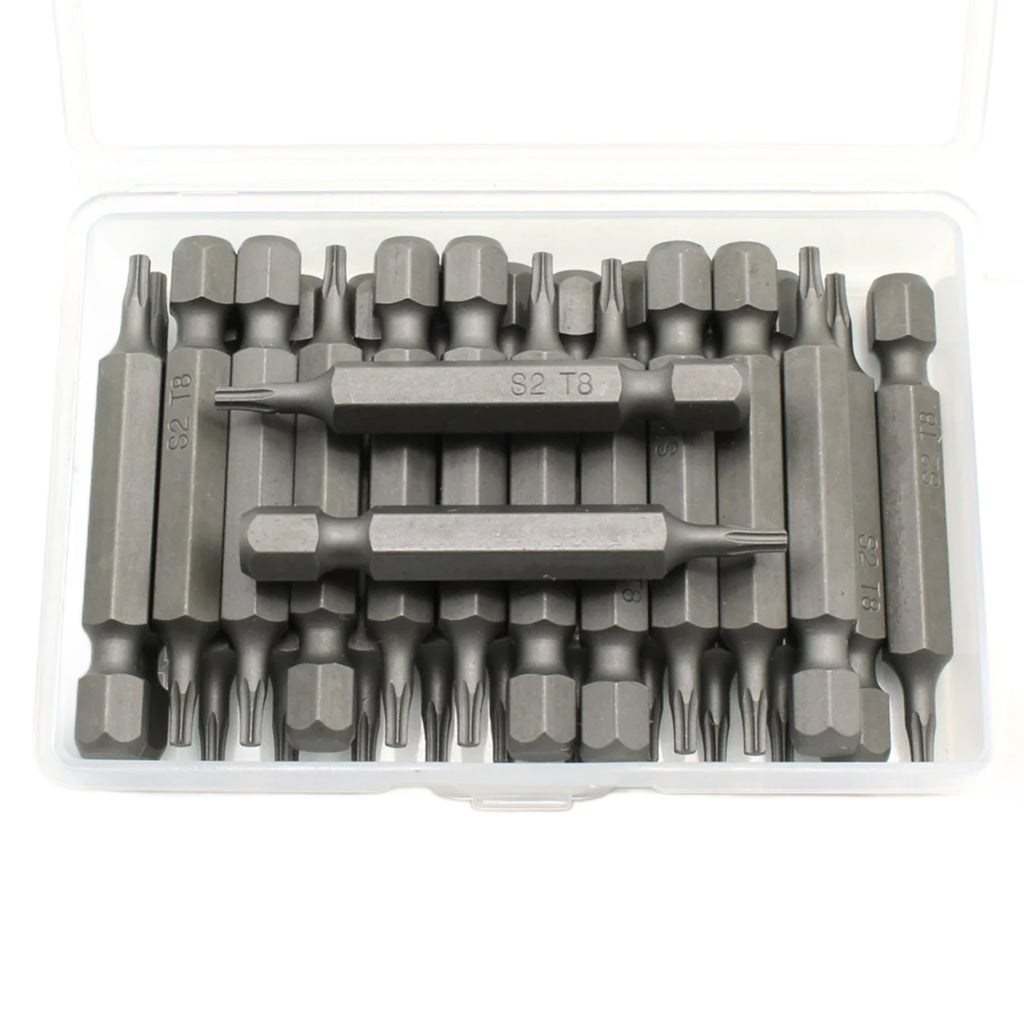 SCREWDRIVER INSERT BITS: 25 pc T8 Torx 6 Point Screwdriver Insert Bits in a plastic storage case.