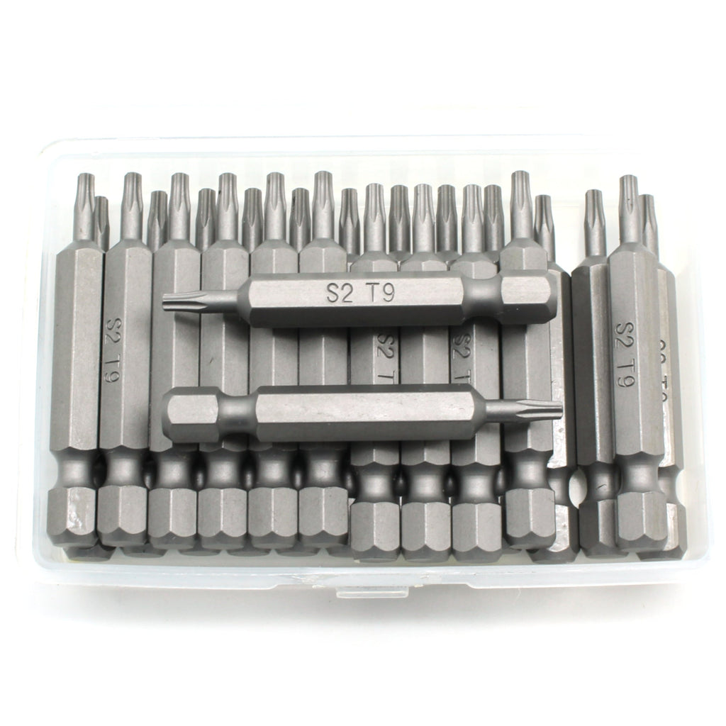 INCLUDED: 25 pc T9 Torx 6 Point Screwdriver Insert Bits in a plastic storage case.