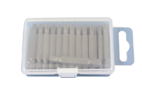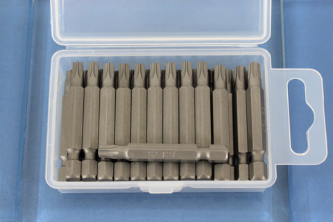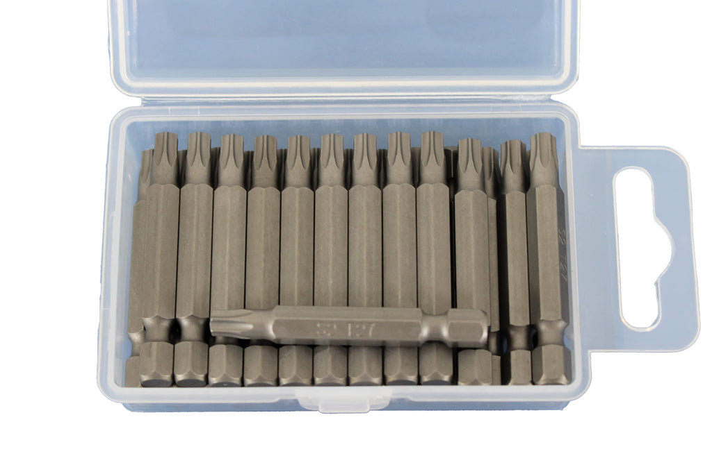 SCREWDRIVER INSERT BITS: 25 pc T27 Torx 6 Point Screwdriver Insert Bits in a plastic storage case.