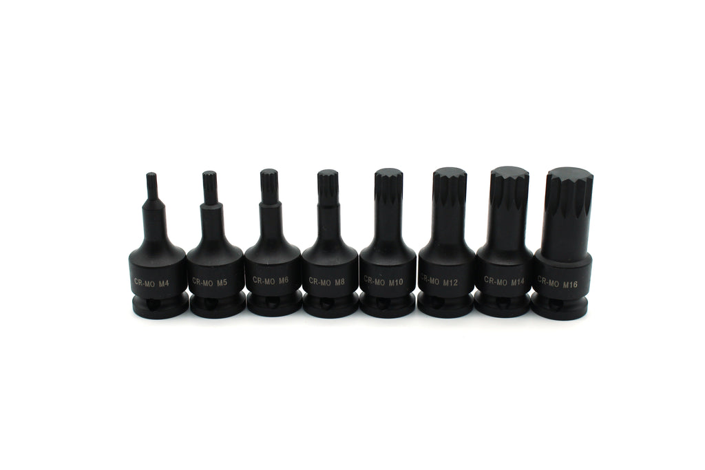 8 pc Spline Socket Bit Set, M4-M16, 2" (50mm) Long, Impact Socket Bit 3/8" Drive Includes: Spline bits M4, M5, M6, M8, M10, M12, M14, and M16 Sockets are 2" long with 3/8" drive Drop forged black chrome moly steel (CR-MO). Includes a heavy duty carrying case. US-BASED CUSTOMER SERVICE: Available by chat, email, phone, or visit us at our customer service center in La Crosse, WI.