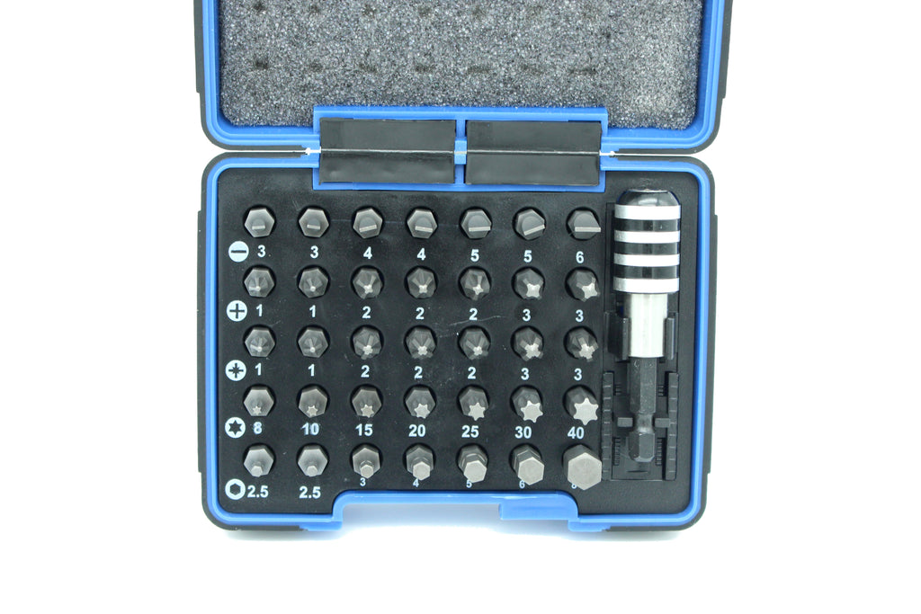 36 pc Impact Ready Screwdriver Bit Set Kit with One Quick Release Chuck Includes one magnetic quick release chuck with Quick Release Slots Includes: PHILLIPS:#1(x2), #2(x2), #3(x2) & SLOTTED: 3(x2), 4(x2), 5(x2), 6mm include POZI: #1(x2), #2(x2), #3(x2) & HEX: 2.5(x2), 3, 4, 5, 6, 8mm & TORX:T8, T10, T15, T20, T25, T30, T40 Includes heavy duty carrying case US-BASED CUSTOMER SERVICE: Available by chat, email, phone, or visit us at our customer service center in La Crosse, WI.