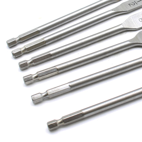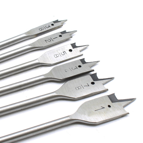 TMAX 6 Bit 3/8" (9.52mm) to 1" (25.4mm) Spade Drill Bit Set Contains sizes: 3/8" (9.52mm), 1/2" (12.7mm), 5/8" (15.88mm), 3/4" (19.05mm), 7/8" (22.22mm), and 1" (25.4mm) 1/4" (6.35mm) Ball Groove Heavy Duty Shanks for quick bit changes and extended life and durability. Overall length: 6" the Extreme Speed Channel for efficient chip removal. Max Life corner preserves nail life US-BASED CUSTOMER SERVICE: Available by chat, email, phone, or visit us at our customer service center in La Crosse, WI.