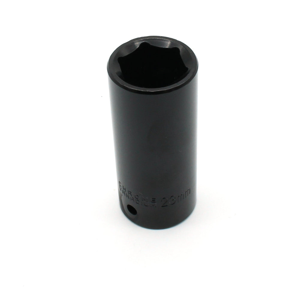 23 mm Impact Socket Made of chrome vanadium with protective finish for heavy duty impact use Deep socket, each is 3" long 1/2" Inch drive Newly available as individual pc from our 10 mm- 24 mm socket set US-BASED CUSTOMER SERVICE: Available by chat, email, phone, or visit us at our customer service center in La Crosse, WI.