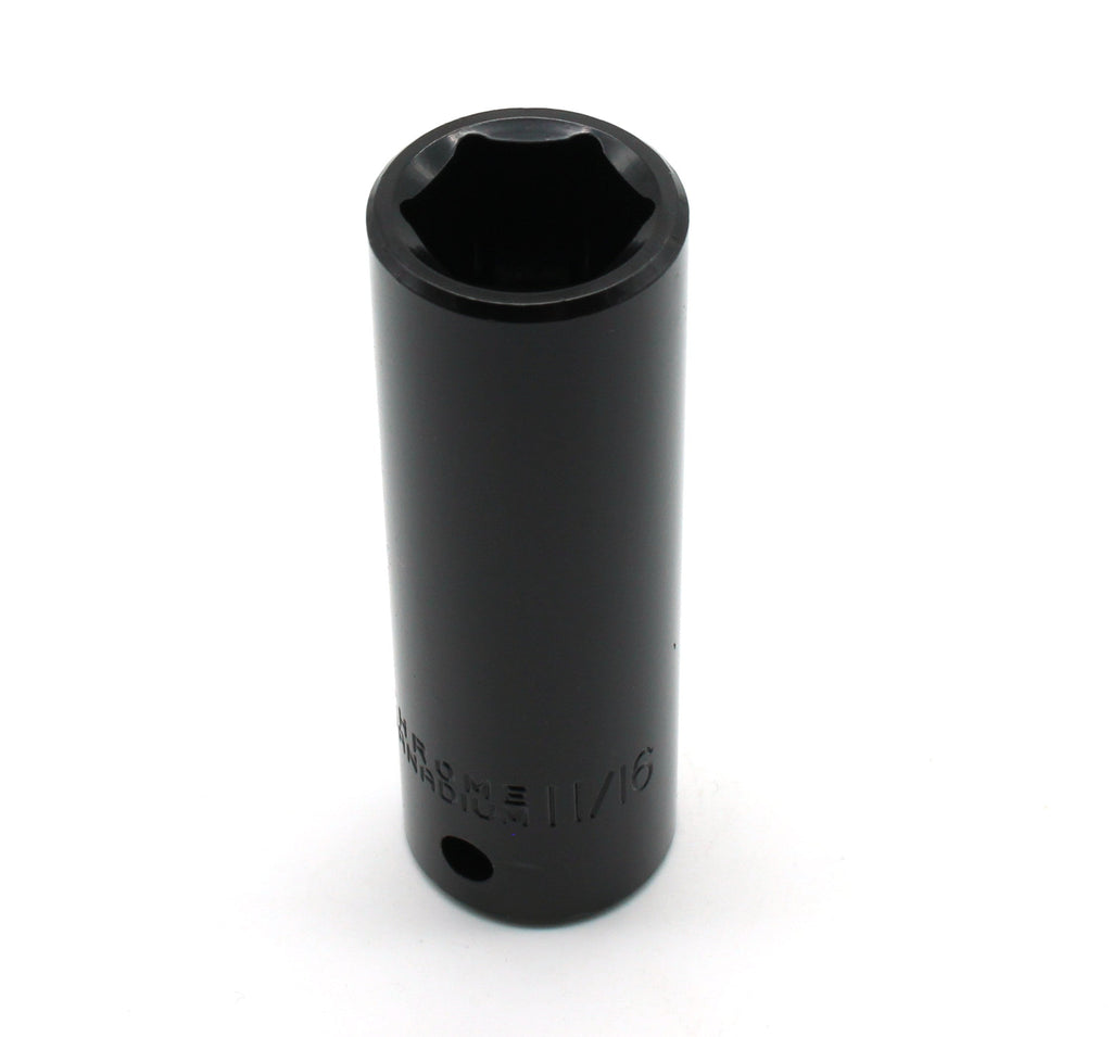 11/16" Inch Impact Socket Made of chrome vanadium with protective finish for heavy duty impact use Deep socket, each is 3" long 1/2" Inch drive Newly available as individual pc from our 3/8 Inch to 1-1/4 Inch socket set US-BASED CUSTOMER SERVICE: Available by chat, email, phone, or visit us at our customer service center in La Crosse, WI.