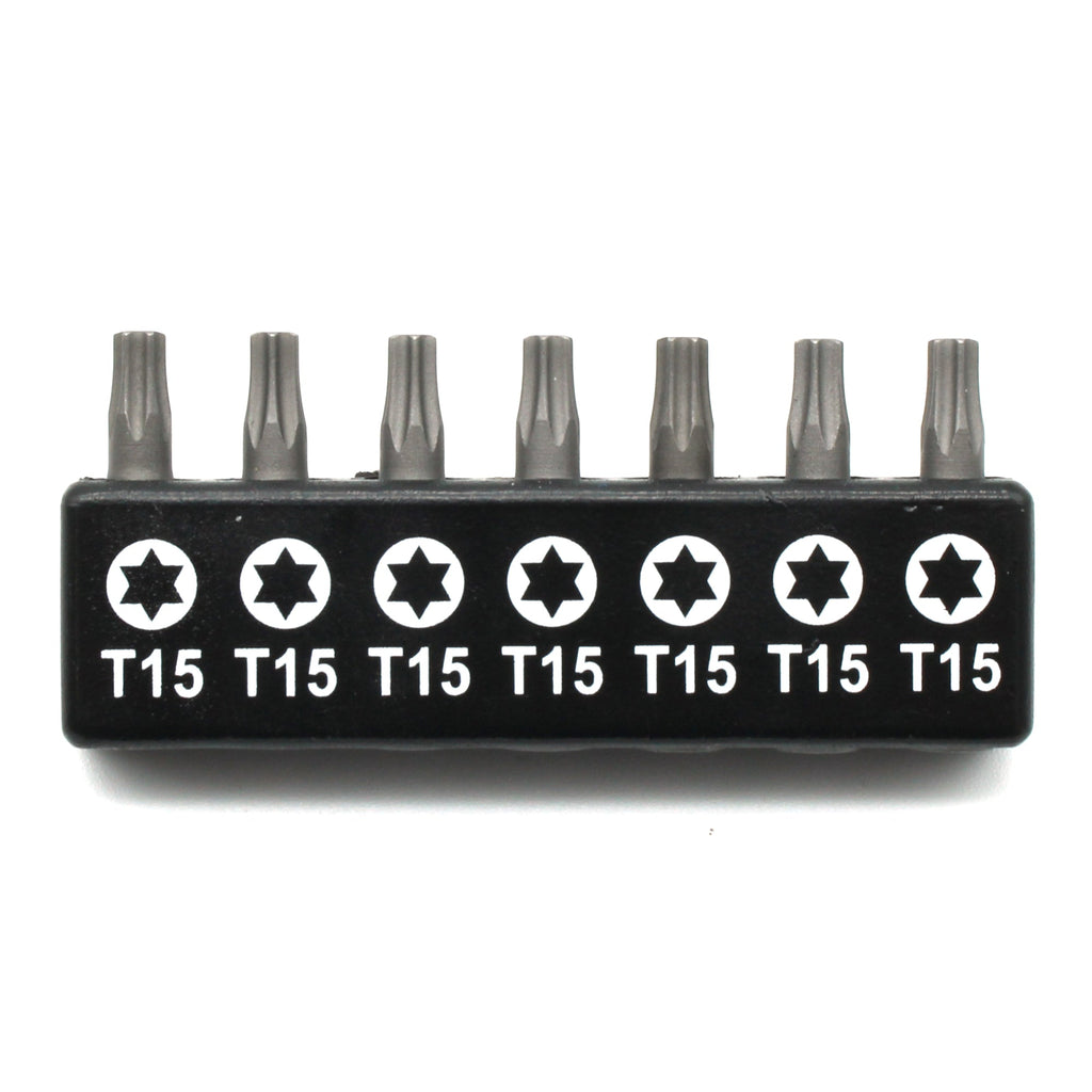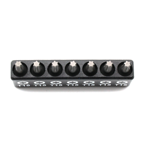 SCREWDRIVER INSERT BITS: 7 pc T15 Torx 6 Point Screwdriver Insert Bits in a plastic storage case.