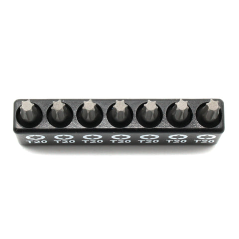 SCREWDRIVER INSERT BITS: 7 pc T20 Torx 6 Point Screwdriver Insert Bits in a plastic storage case.