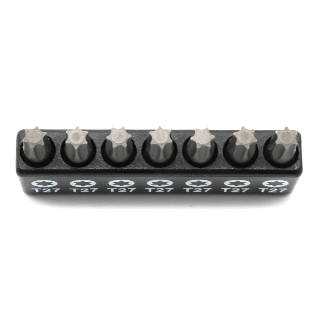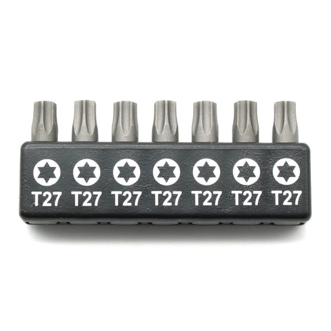 SCREWDRIVER INSERT BITS: 7 pc T27 Torx 6 Point Screwdriver Insert Bits in a plastic storage case.