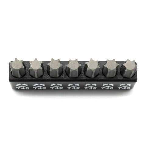 INCLUDES: A 7-pack of 1" T40 (T-40) Torx bits with a convenient plastic holder that displays the head size and pattern.