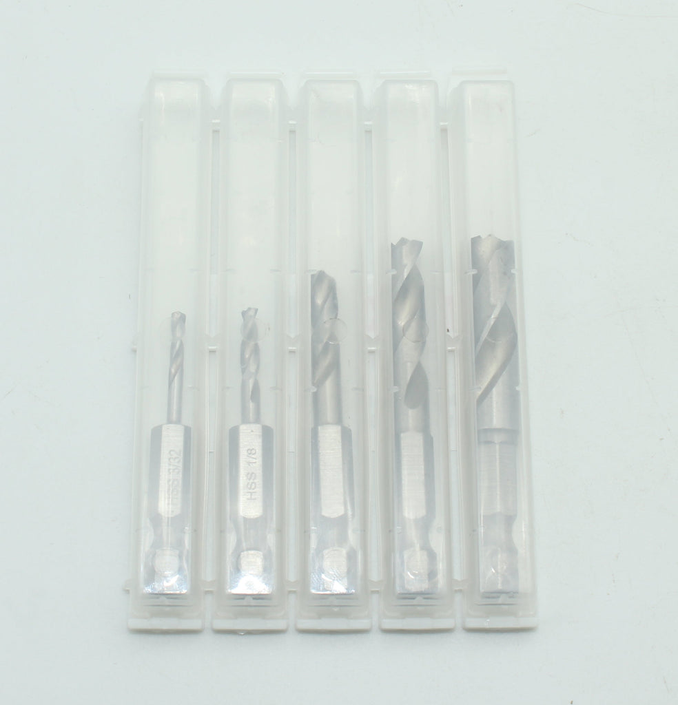 5 pc M35 Cobalt Jobber Drill Bit Set, 1/4" Hex Shank for Quick Chucks & Impact Drivers, SAE Sizes 3/32"-1/8"-3/16"-1/4"-5/16"; total length 1-3/4", 1-3/4", 2-1/16", 2-1/4", 2-1/4"; working length 3/4", 3/4", 1", 1-1/4", 1-1/4"