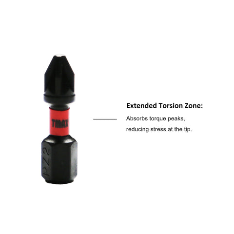 TORQUE ABSORPTION: Made to handle the extreme power of high-torque impact drivers and last longer than standard impact bits. Unique Torque Absorbing Zone help to improve bit life by absorbing and transferring torque at bit tip to the torsion zone.