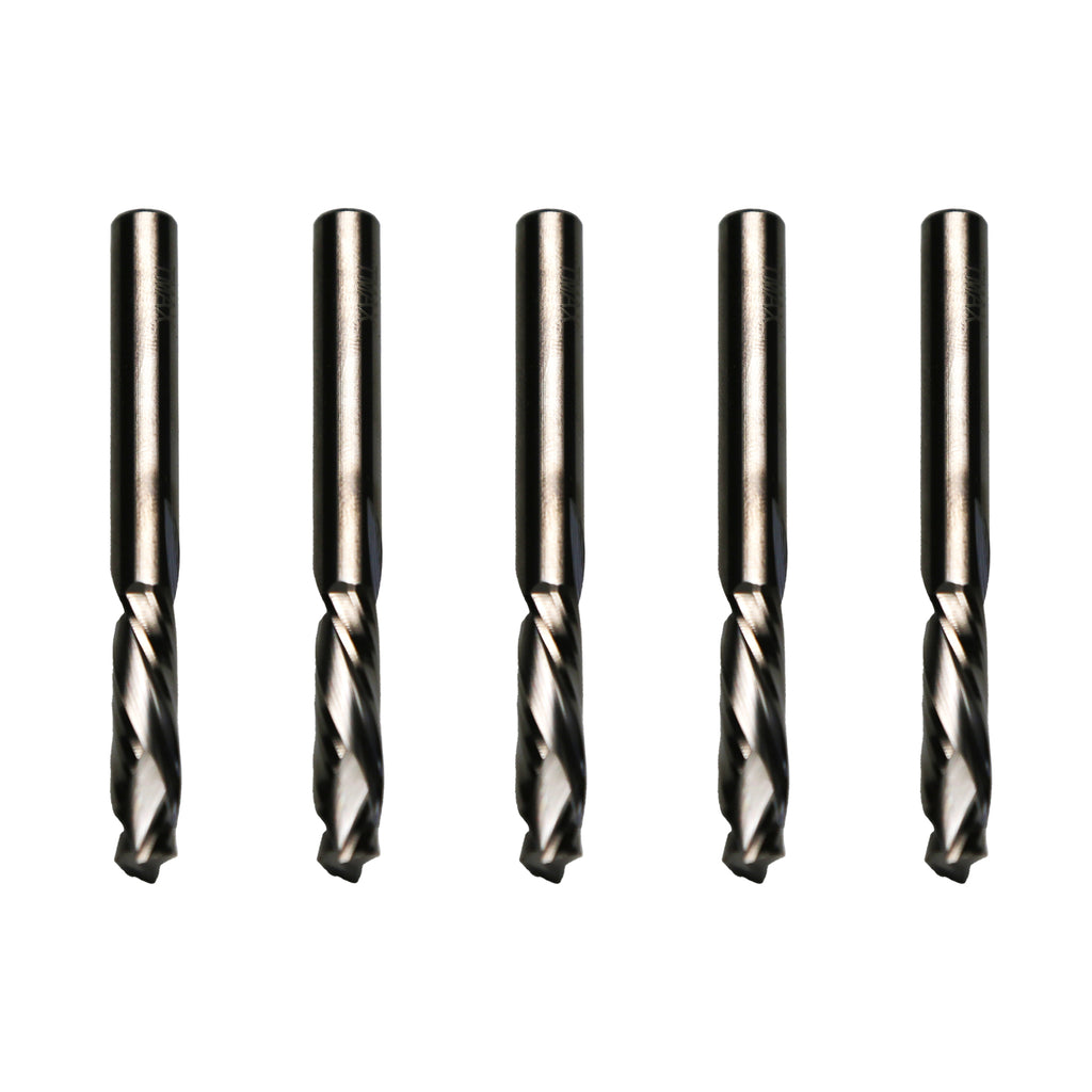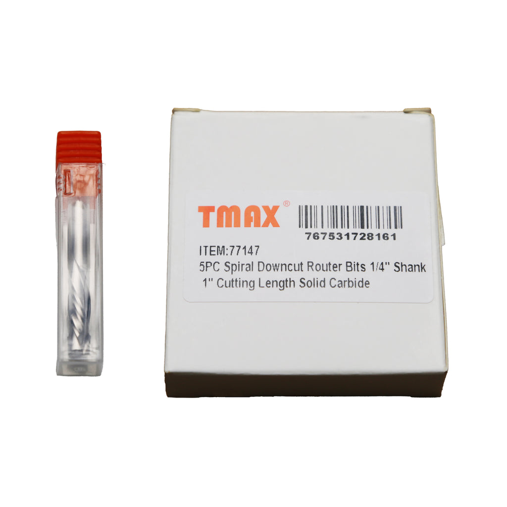 DOWNCUT ROUTER BIT: 5 pc Solid carbide down cut router bits with 1/4" shank and 1/4" cutting diameter, 1" cutting length, 2 1/2" in total length. Can be used on routers with a 1/4" collect.