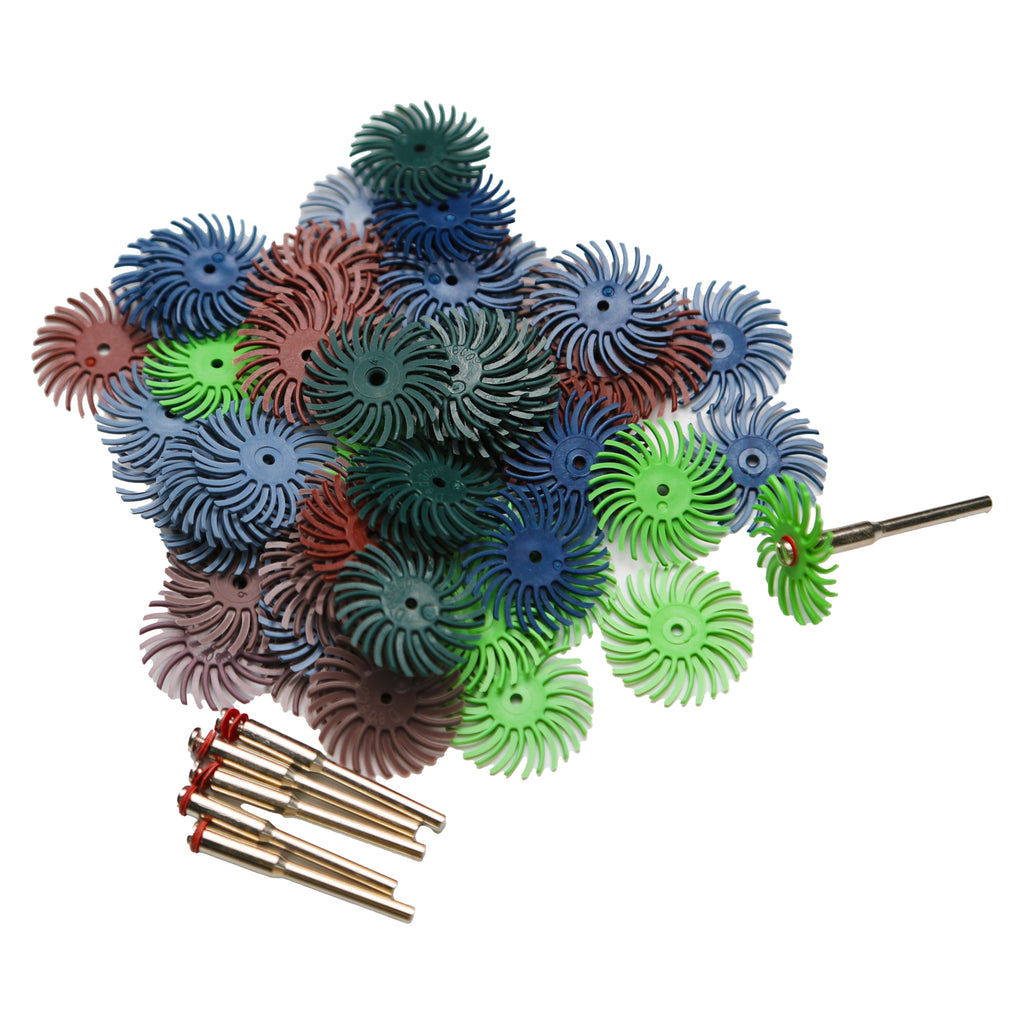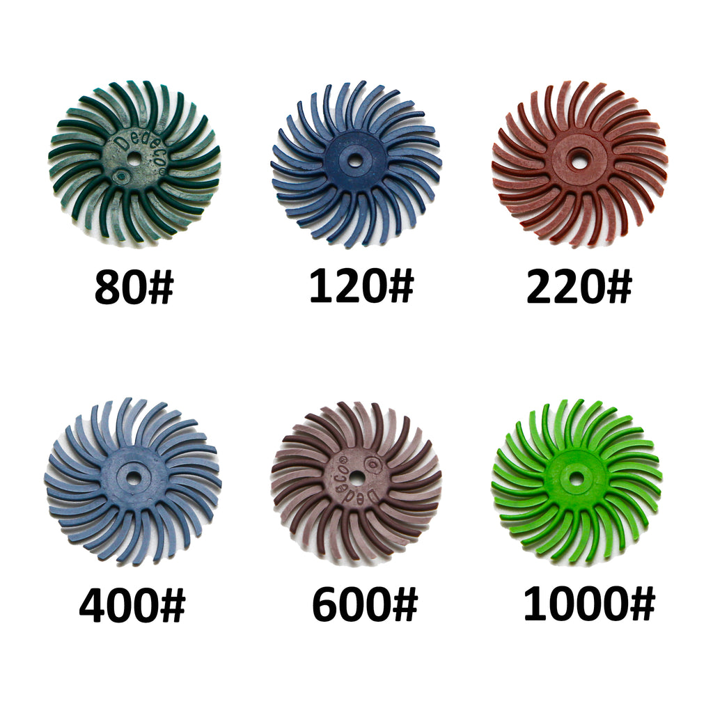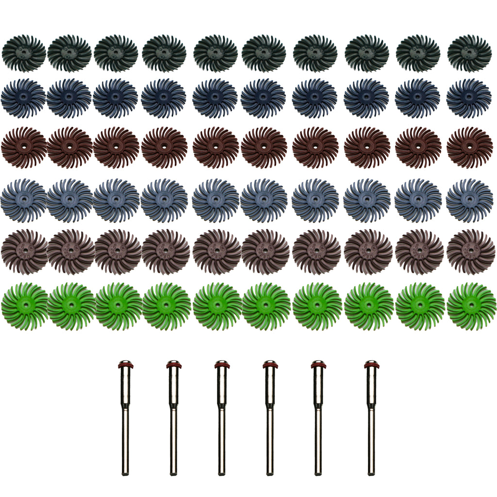 Our rotary tools accessories - polishing brushes have 6 different grit and every grit has 10 pc . Green-80 grit, Blue-120 grit, Red-220 grit, Gray Blue-400 grit, Purple-600 grit, Light Green-1000 grit.There are six mandrel(6 pc 1/8"mandrel)