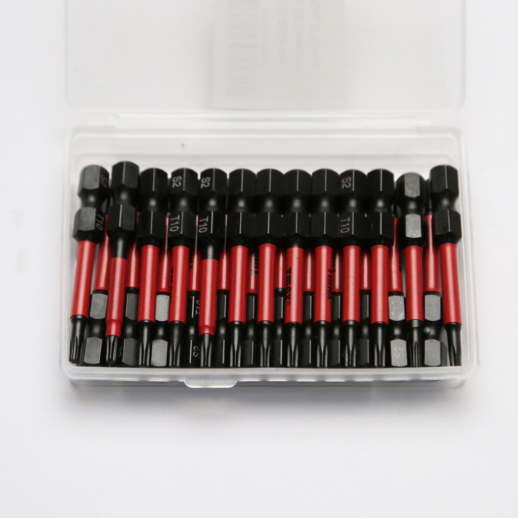 SCREWDRIVER INSERT BITS: 25 piece set of 2 inch, T10 Torx driver bits. 1/4" (6.35mm) Hex Shank fits electric screwdrivers, hand screwdrivers, electric drills, air drills. Packaged in a customized box.
