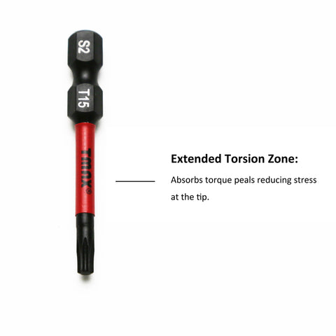 Made to handle the extreme power of high-torque impact drivers and last longer than standard impact bits. Unique Torque Absorbing Shoulder Power Rings help to improve bit life by absorbing and transferring torque at bit tip to the torsion zone.