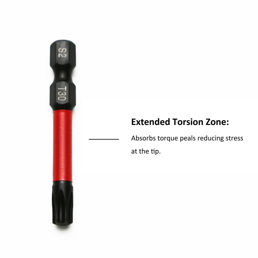 Made to handle the extreme power of high-torque impact drivers and last longer than standard impact bits. Unique Torque Absorbing Shoulder Power Rings help to improve bit life by absorbing and transferring torque at bit tip to the torsion zone.