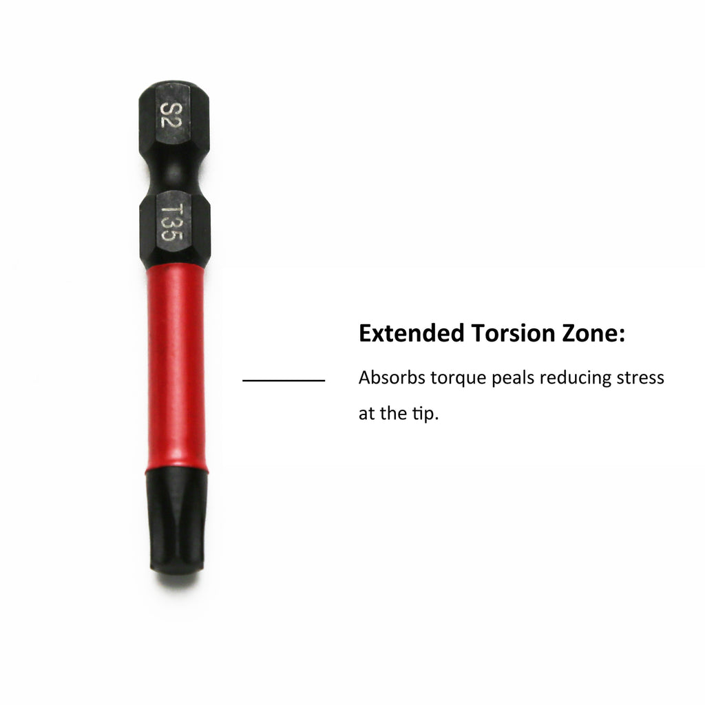 Made to handle the extreme power of high-torque impact drivers and last longer than standard impact bits. Unique Torque Absorbing Shoulder Power Rings help to improve bit life by absorbing and transferring torque at bit tip to the torsion zone.
