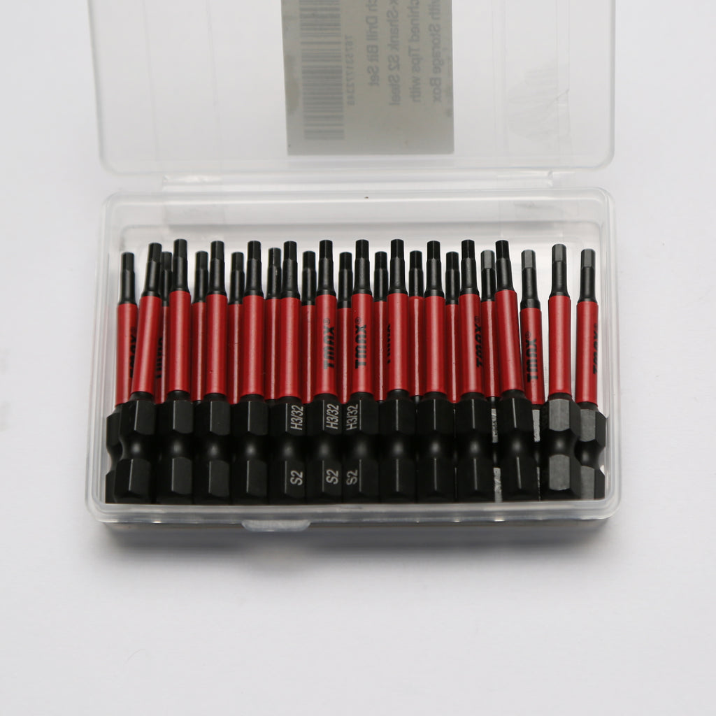 SCREWDRIVER INSERT BITS: 25 piece set of 2 inch, H3/32 Hex Head Allen Wrench driver bits. 1/4" (6.35mm) Hex Shank fits electric screwdrivers, hand screwdrivers, electric drills, air drills. Packaged in a customized box.