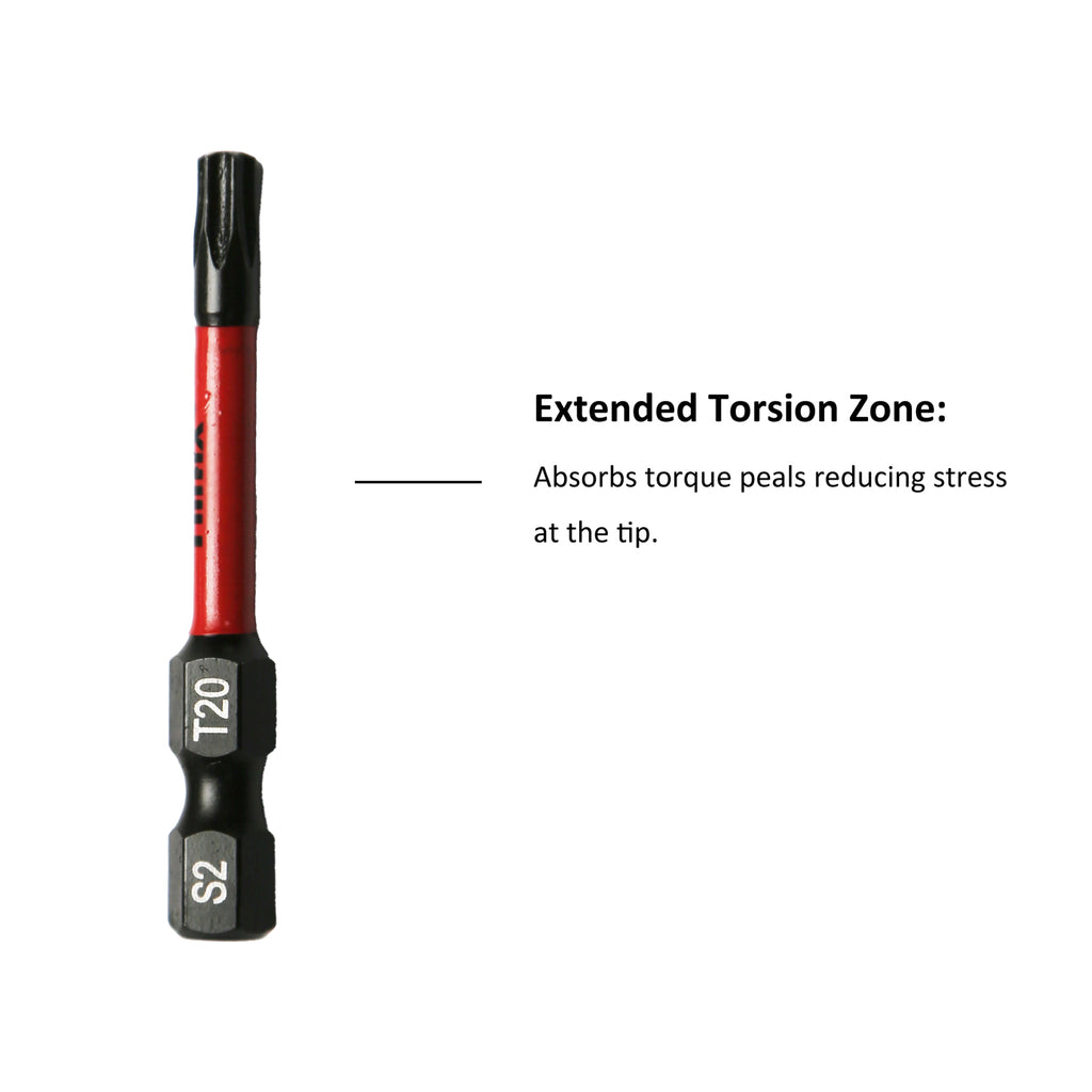 TORQUE ABSORPTION: Made to handle the extreme power of high-torque impact drivers and last longer than standard impact bits. Unique Torque Absorbing Zone help to improve bit life by absorbing and transferring torque at bit tip to the torsion zone.