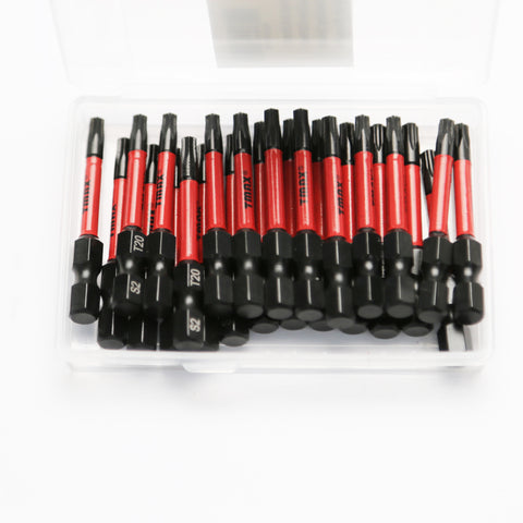 SCREWDRIVER INSERT BITS: 25 piece set of 2 inch, T20 Torx driver bits. 1/4" (6.35mm) Hex Shank fits electric screwdrivers, hand screwdrivers, electric drills, air drills. Packaged in a customized box.