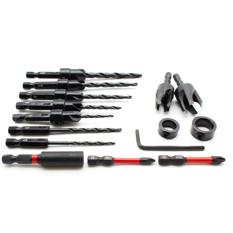This drill bit set including 7 taper drill bits: 7/64"*2, 9/64"*2, 11/64", 3/16", 7/32", 2 plug cutting knives (3/8" and 1/2"), 1 hex wrench, 2 depth stop rings (3/8" and 1/2"), 2 phillips screwdriver bits (PH1 and PH2), and 1 extension drill rod.