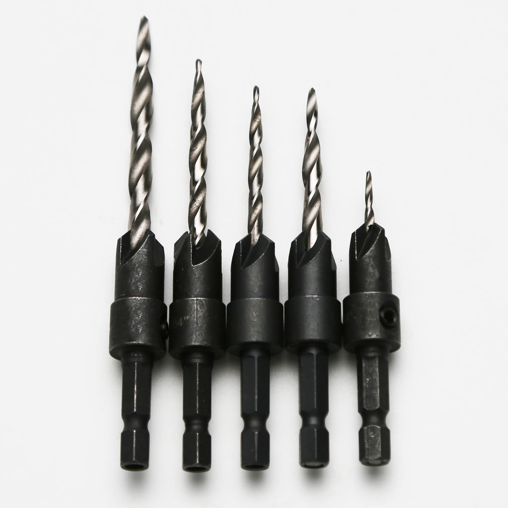 Reliable countersink drill bits secured with pin in 1/4" hex shank; counter sink drill bit for wood to predrill screw #4(7/64") #6(9/64") #8(11/64") #10(3/16") #12(7/32") made to drill, countersink, and counter-bore in 1 step. This set does not include depth stop.